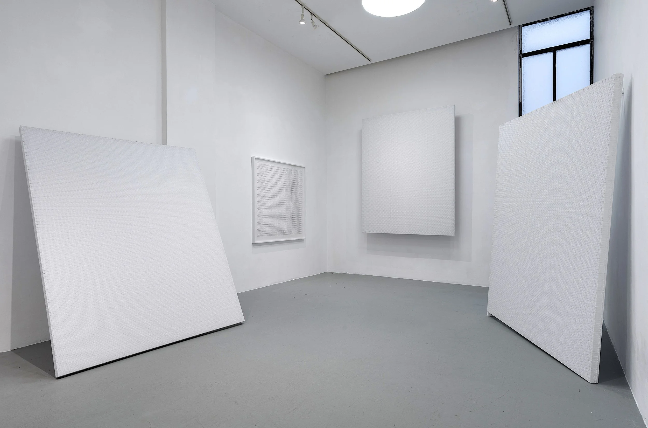 4 handwoven objects (183 x 233 x 6 cām), 4 drawings