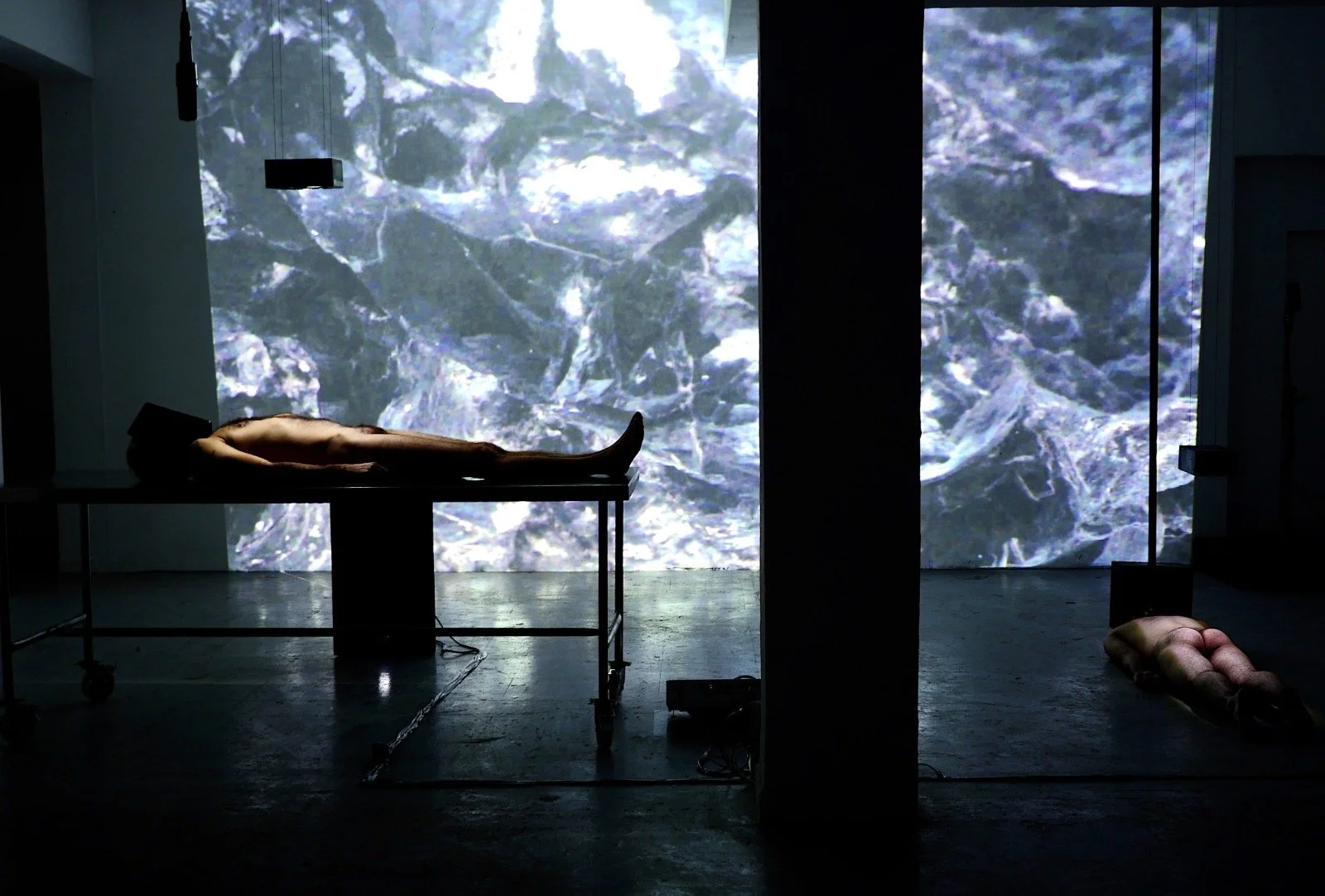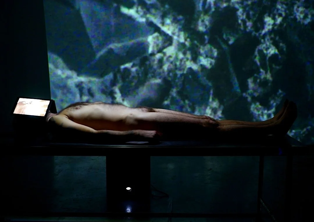 At its core are two performers: one transgender (FTM) and one heteronormative. The transgender performer wears a mask made of digital tablets, each screening a video of a hand digging into the earth until a source of light appears. The heteronormative performer lies face down, his head supported by a suspended black cube. A third projection shows the ceiling of a cave, its camera movements following the rhythm and intonation of Wallach’s recorded voice reading the poem.